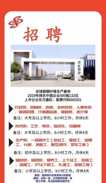 2、招聘,上丝,移料工,工资6000~10000,长白班,下丝工,备管工,三班倒8小时,平望厂区,3.招聘摇袜工,外检工,10人,工资4500-7000,早中班,无夜班,盛泽厂区,。 3.招聘加弹工10人,三班倒8小时,工资4500~7000。 5.倒筒工2人,年龄40-48岁,工资4000~5500,辅材工,年龄45-55之间,要求男,工资5000-5500,6.中控员2名,要求女,年龄18-35,工资5000~6000以上月休4天,五险一金