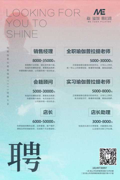 小白老师,助教老师,瑜伽老师,普拉提老师,会籍顾问,销售精英,实习店长,店长助理