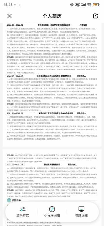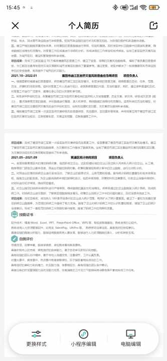 熟练使用人力资源管理软件,熟悉劳动法律法规,如用友TalentPay,具备较强的数据分析能力,能够运用数据支持人事决策,PowerPoint Offic,UltiPro等,分析和报告生成,具备良好的合规意识。,能够进行人力资源数据的录入,熟练使用办公软件。(详细内容请见照片,里面包括个人简历和项目经历)