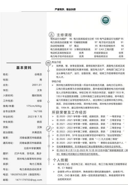1.2023年毕业于郑州电力高等专科学校,电力系统自动化技术专业。2.有高压电...