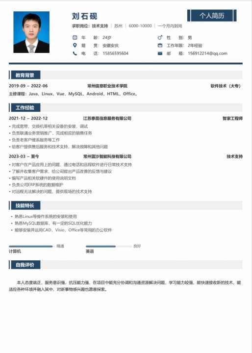 大专,软件技术专业,2021-12到2022-12在江苏泰昆信息服务有限公司做智家工...