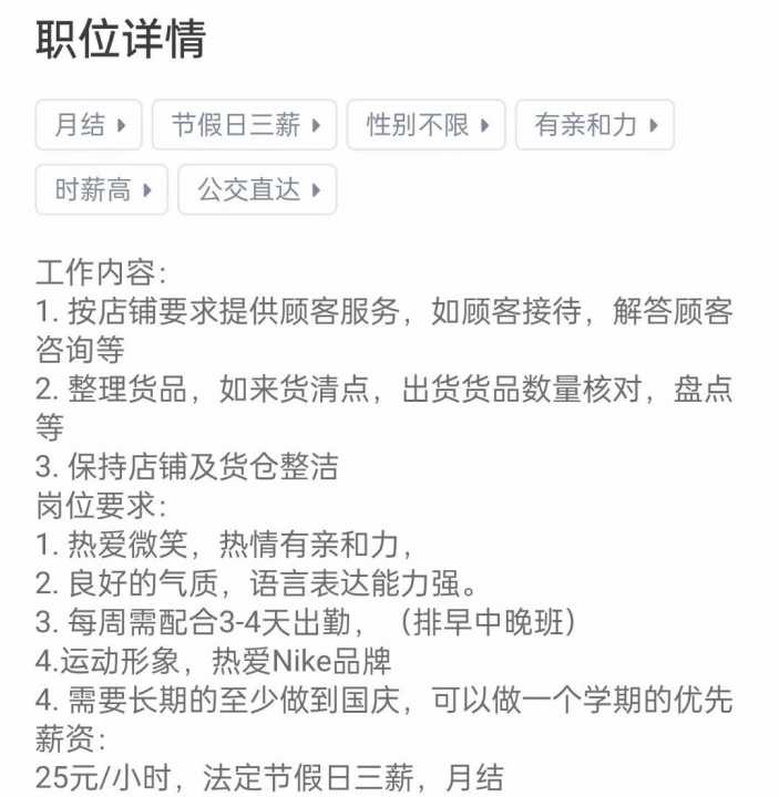 节假日三薪,性别不限,有亲和力,时薪高工作内容:1.按店铺要求提供顾客服...
